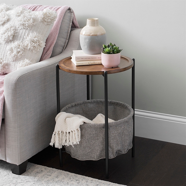 Amazon Brand Rivet Meeks Round Side Table With Fabric Storage Basket 24 H Walnut And Grey Farmhouse Goals